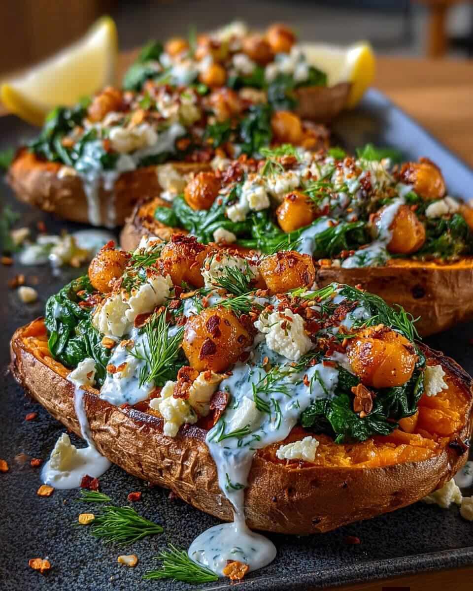 Stuffed Sweet Potatoes with Spinach, Feta & Lemon-Herb Drizzle These stuffed sweet potatoes are hearty, colorful, and full of fresh Mediterranean-style flavor. Roasted sweet potatoes turn soft and naturally sweet, making the perfect base for savory garlicky spinach, creamy feta, and nutty chickpeas. A cool lemon-herb yogurt drizzle ties everything together with brightness and freshness. … Read more
