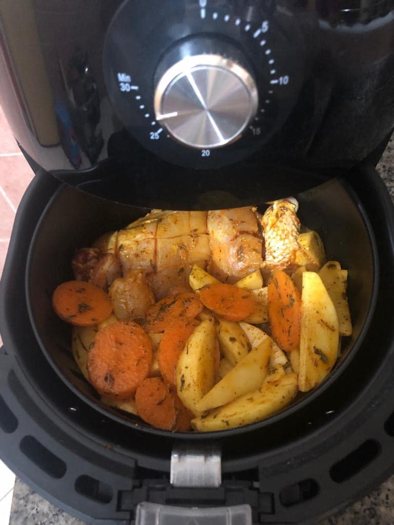 A recipe for chicken cooked in an air fryer, with potatoes and carrots