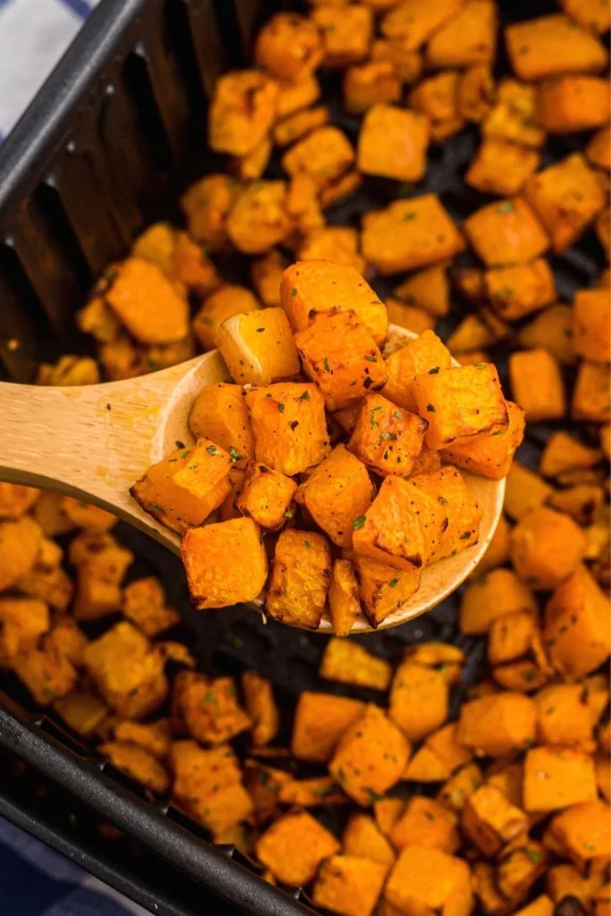 A simple, tasty, and nutritious side dish, air-fried butternut squash preserves the natural sweetness of this golden vegetable while maintaining its ideal tenderness and slightly crunchy texture.