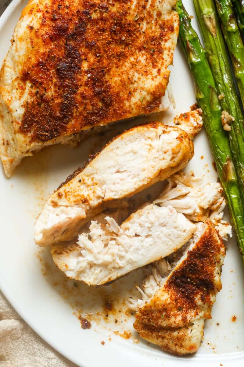 - Drizzle olive oil on top of each breast. Season all over with garlic powder, paprika, sea salt, pepper, and onion powder.