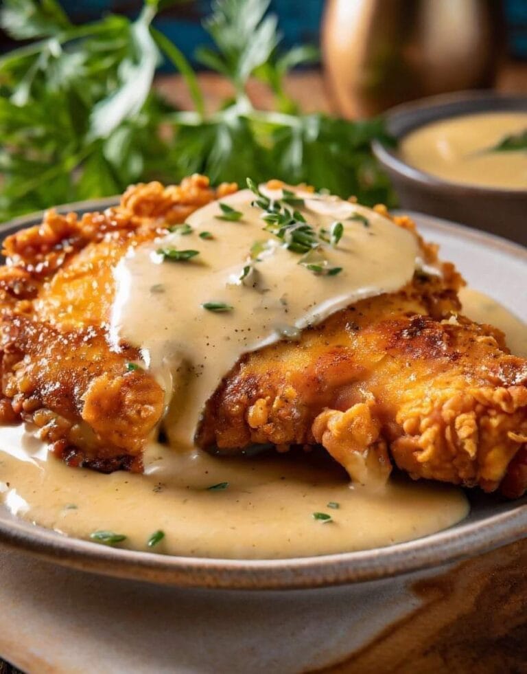 Take out of the air fryer and, if needed, repeat with the remaining steaks. Serve right away with a white pepper gravy on top.