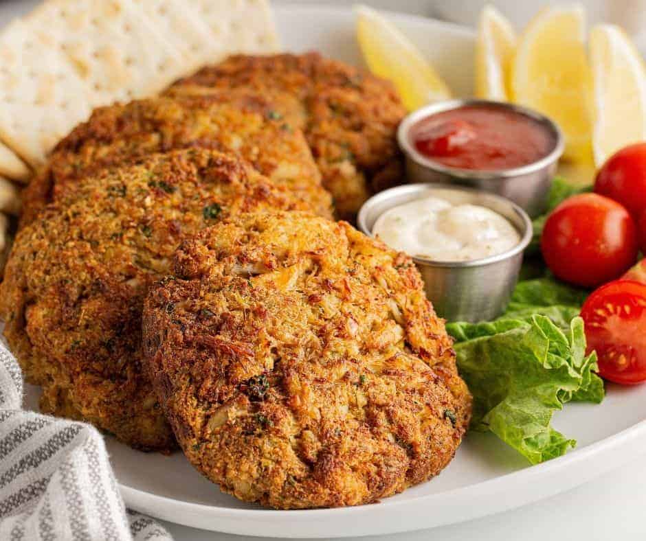 In Maryland, crab cakes are often served with saltine crackers, lettuce, and tomatoes.