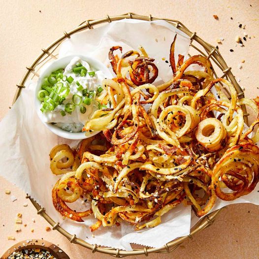 Air Fryer Curly Bagel Yogurt Scallion Dip: Using an air fryer and spiralizer, you can make curly fries that rival those seen in restaurants at home. While the insides of the potatoes remain creamy, the outsides turn crispy. The fries go well with a fast scallion-cream cheese-yogurt dip that will make you think of your favourite bagel.