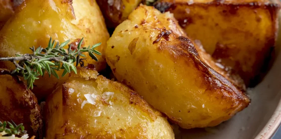Roasting potatoes in the oven requires you to roast the potatoes in a roasting tray with fat in. The potatoes are sitting in the hot fat. This is what helps to give the potatoes that ‘crunchy shell’.