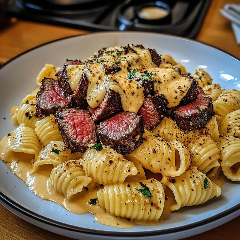 Plate the creamy pasta with steak bites, and garnish with fresh parsley if desired.
