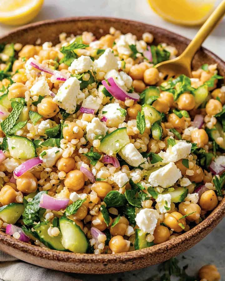 The Aniston Salad is inspired by Jennifer Aniston’s favorite go-to salad, which she reportedly ate daily while filming Friends. This salad is light, fresh, packed with protein, and loaded with Mediterranean flavors! It features a mix of quinoa (or bulgur), chickpeas, feta, cucumber, fresh herbs, and a lemony dressing.