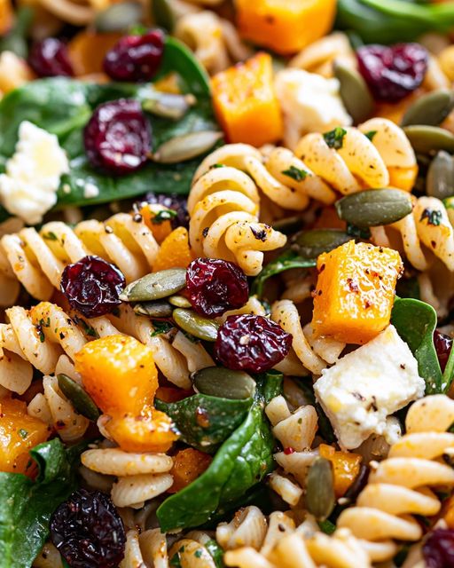 In a large bowl, combine cooked pasta, roasted butternut squash, diced apple, dried cranberries, toasted pecans, feta cheese, and pumpkin seeds.