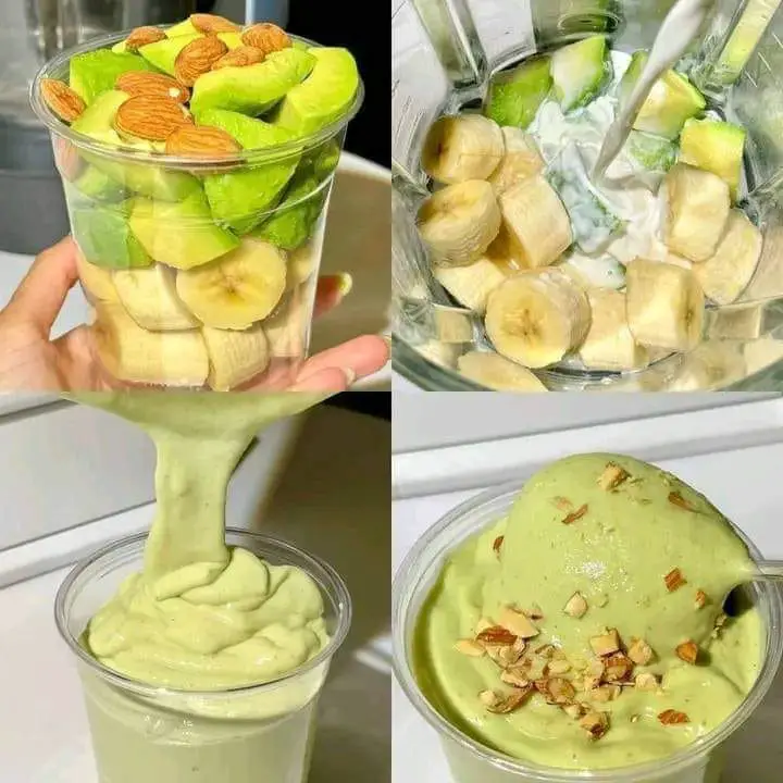 - In a blender, combine the avocado, frozen banana, spinach leaves (if using), milk, Greek yogurt, honey or maple syrup (if using), and vanilla extract.