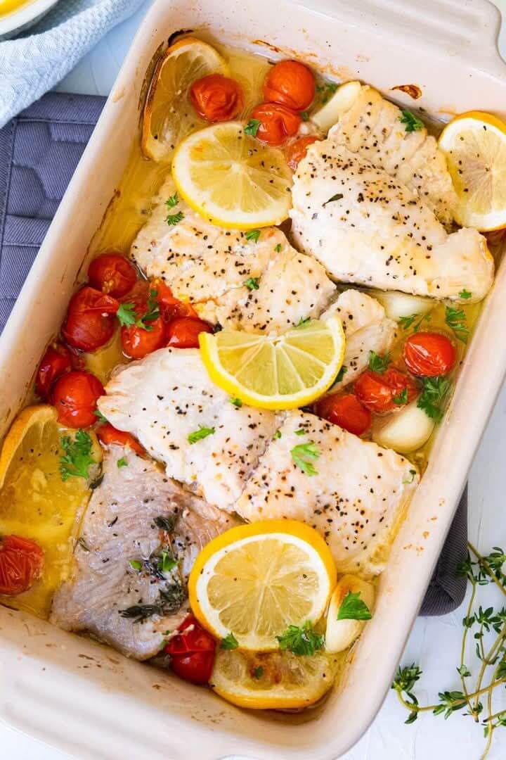 Arrange the cherry tomatoes, lemon slices, and garlic cloves around the catfish pieces in a baking dish.