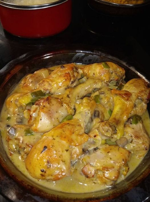 BAKED LEGS WITH CREAM OF MUSHROOM Tender baked chicken paired with a thick, creamy mushroom sauce makes for a tasty and cosy dish: baked chicken legs with cream of mushroom. This recipe is great for a big occasion or a cosy family dinner because it’s simple to make.