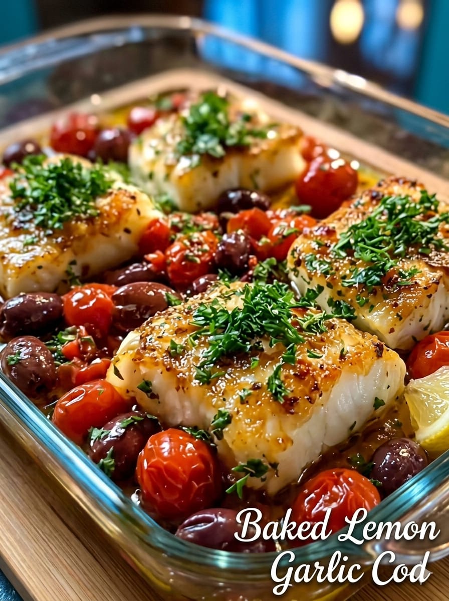 Baked lemon garlic cod is one of those reliable, go-to dishes that delivers big flavor with very little effort. Light, flaky cod is baked in a bright, garlicky lemon sauce alongside juicy tomatoes and briny olives, creating a simple Mediterranean-style meal that feels both fresh and satisfying. It’s perfect for weeknights when you want something quick but still wholesome, and it pairs beautifully with rice, roasted vegetables, or crusty bread to soak up the flavorful juices.