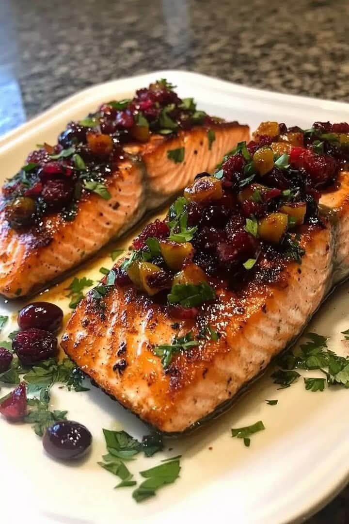 Baked Salmon with Cranberry Salsa and Pecans (Mediterranean-Style)