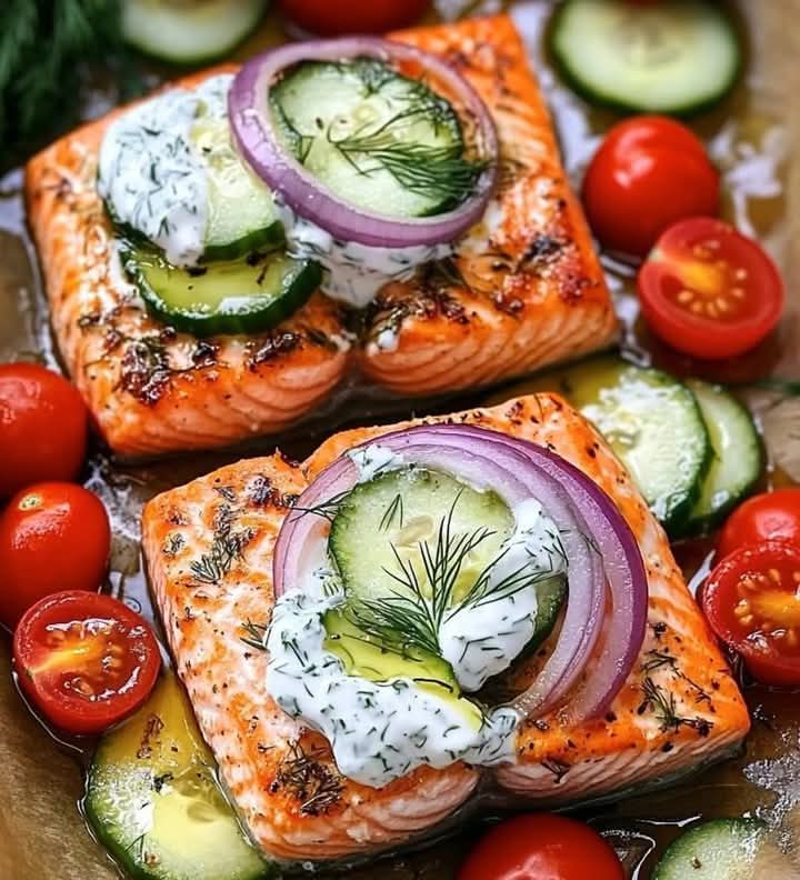 This Baked Salmon with Tangy Dill Dressing is a vibrant, Mediterranean-inspired dish that balances the richness of wild-caught salmon with a refreshing, creamy dill sauce. A splash of balsamic vinegar and lemon in the marinade gives the salmon a bold, slightly sweet tang that pairs beautifully with the delicate fish. The creamy dill dressing brings cooling freshness, while an optional Greek salsa topping—with juicy tomatoes, crisp cucumbers, briny olives, feta, and a hint of heat—takes this dish to another level.