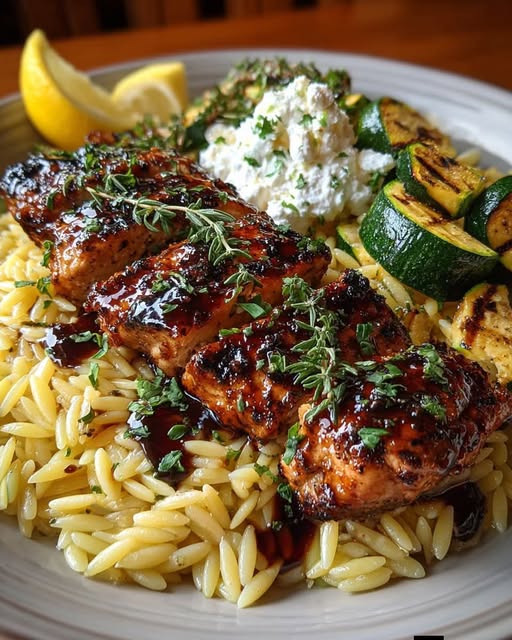 If you’re looking for a restaurant-style meal that’s easy enough for a weeknight, this Balsamic Glazed Chicken & Orzo with Whipped Feta & Grilled Zucchini is the perfect choice. It combines juicy, caramelized chicken coated in a tangy balsamic glaze with tender orzo pasta, creamy whipped feta, and smoky grilled zucchini. The balance of sweet, savory, and fresh flavors makes this dish both comforting and elegant. Plus, it’s a complete meal in one plate—protein, carbs, and veggies—making it ideal for family dinners or casual entertaining.