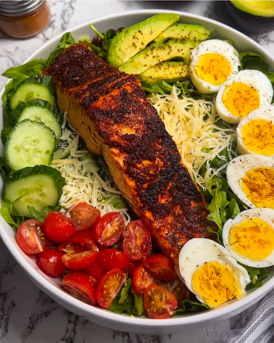 This salad bowl is all about balance—smoky, blackened salmon pairs with creamy avocado, crisp greens, and perfectly boiled eggs to create a meal that’s colorful, flavorful, and filling. Fresh vegetables and a light dressing keep it bright, while a sprinkle of cheese adds richness. It’s a simple way to enjoy a nutrient-packed, high-protein meal that’s ready in under 30 minutes.