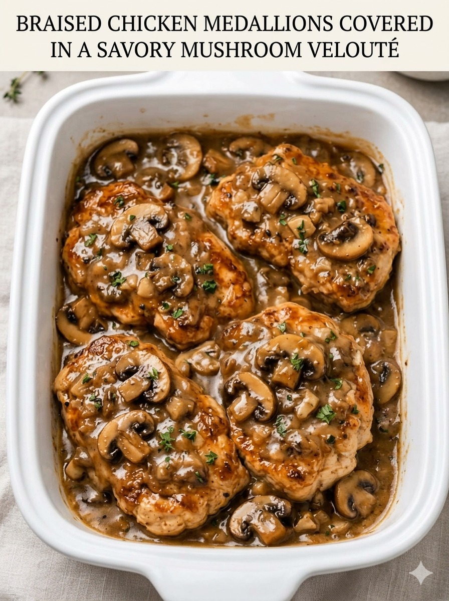 Braised Chicken Medallions Covered in a Savory Mushroom Velouté