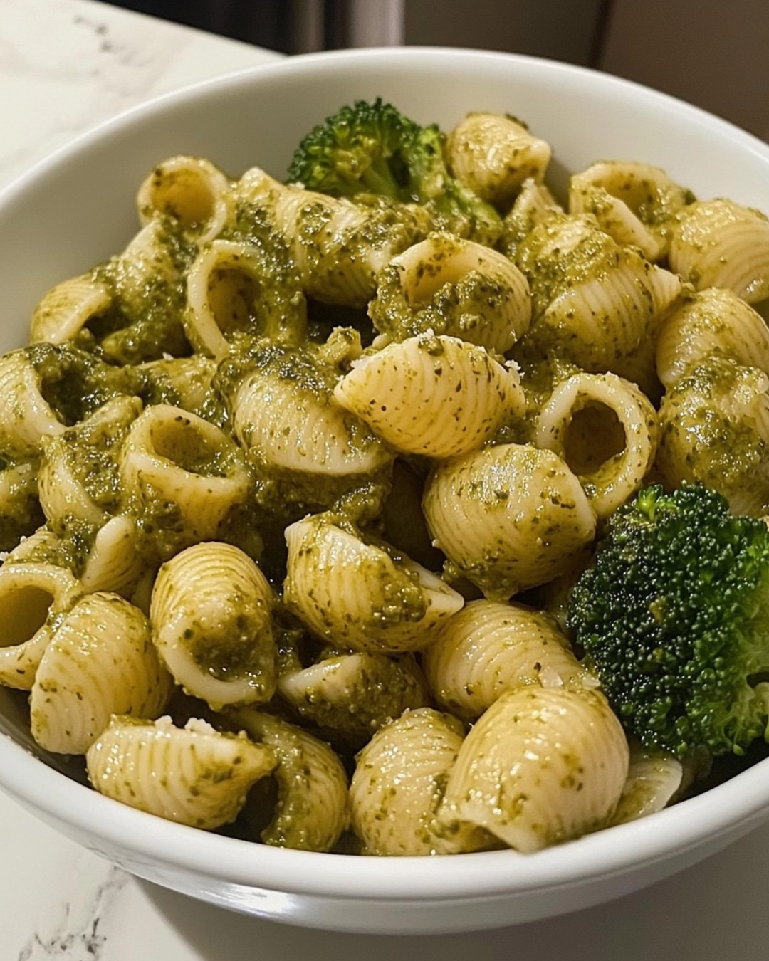 – Toss the pasta with the pesto; – If necessary, add pasta water; – Mix until the substance becomes creamy; – Fold in the broccoli