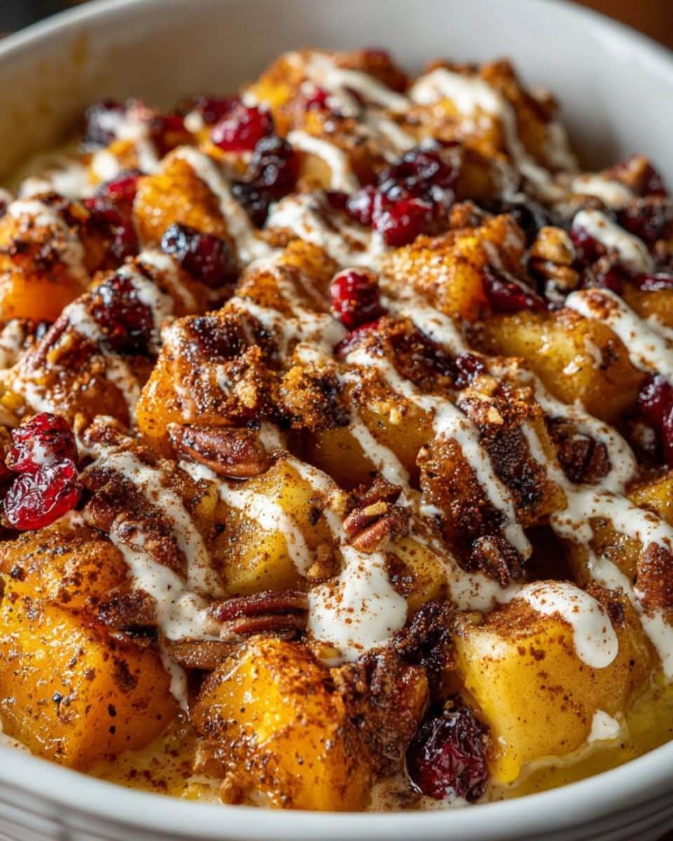 This warm fall-and-winter bake blends roasted butternut squash, soft apples and tart cranberries with a lightly sweet glaze. The flavors feel cozy and festive without being heavy. The honey drizzle adds a glossy finish, the cinnamon whip brings a creamy counterpoint and the pumpkin spice swirl gives it a playful holiday touch. It works as a brunch side, a holiday dish or even a warm dessert with a spoon of ice cream. Everything bakes in one pan, which keeps it simple, and the toppings come together quickly while the fruit and squash roast. The result feels both rustic and elegant.