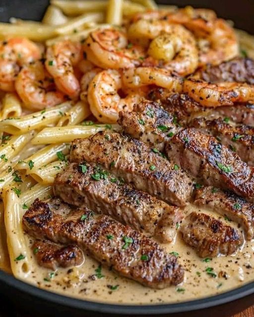 Combine ingredients: Add the cooked steak and shrimp to the Alfredo sauce. Toss to coat.