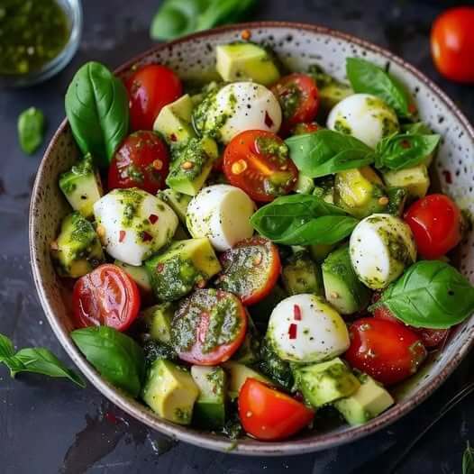 A vibrant twist on the classic Caprese, this salad pairs creamy avocado and fresh basil pesto with juicy tomatoes and mozzarella for a refreshing, nutrient-rich dish perfect for summer or anytime you need a burst of flavor.