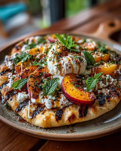Charred Peach & Burrata Flatbread with Black Lava Salt & Hot Honey is all about contrast and balance. Sweet caramelized peaches meet creamy burrata, bright mint, subtle heat, and a final crunch of mineral salt. It feels elegant but requires minimal effort, making it ideal for warm evenings or casual entertaining.