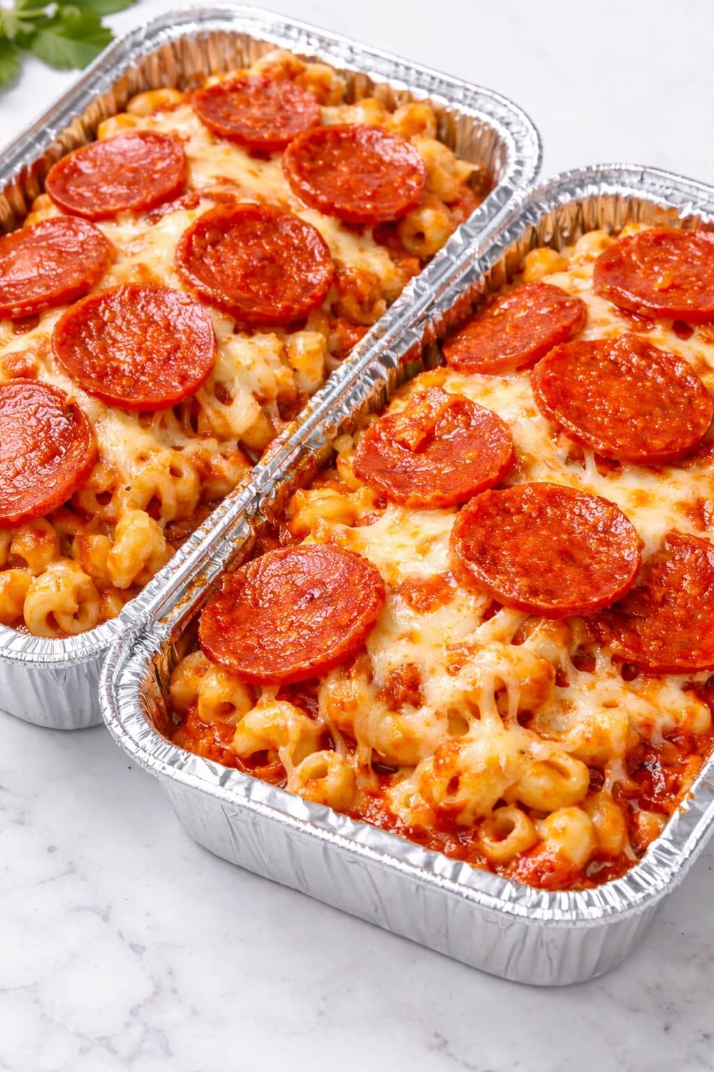 - Assemble: Preheat oven to 190°C (375°F). Transfer the pasta mixture into a baking dish or foil trays. Top with remaining cheese, arrange pepperoni slices evenly, and sprinkle Parmesan cheese on top.