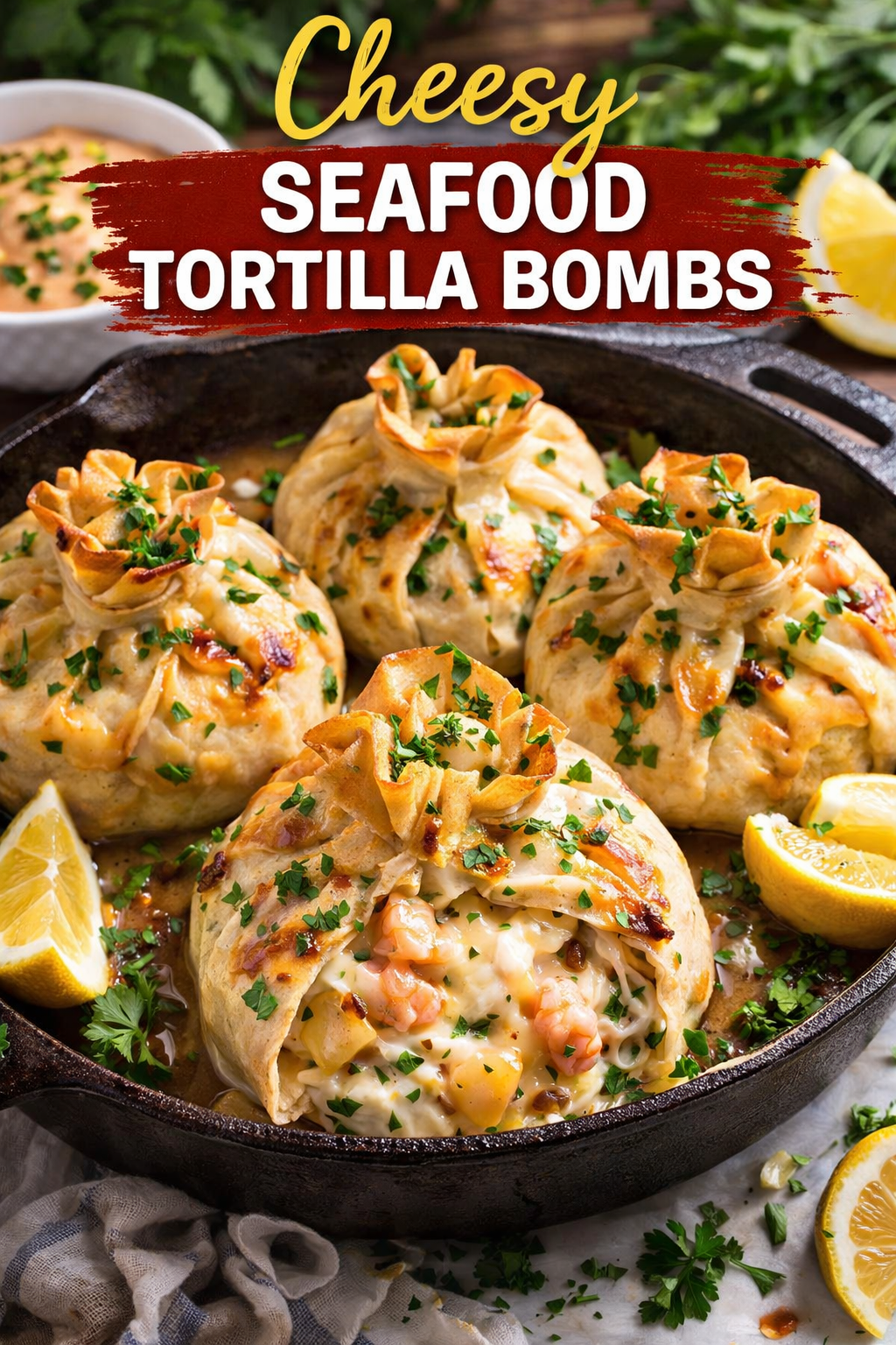 These Cheesy Seafood Tortilla Bombs are crispy on the outside and irresistibly creamy on the inside. Packed with a rich mixture of shrimp, crab (or mixed seafood), melted cheese, and savory spices, each tortilla is folded into a “bomb” and baked or pan-seared to golden perfection. Perfect as an appetizer, party snack, or indulgent main dish.