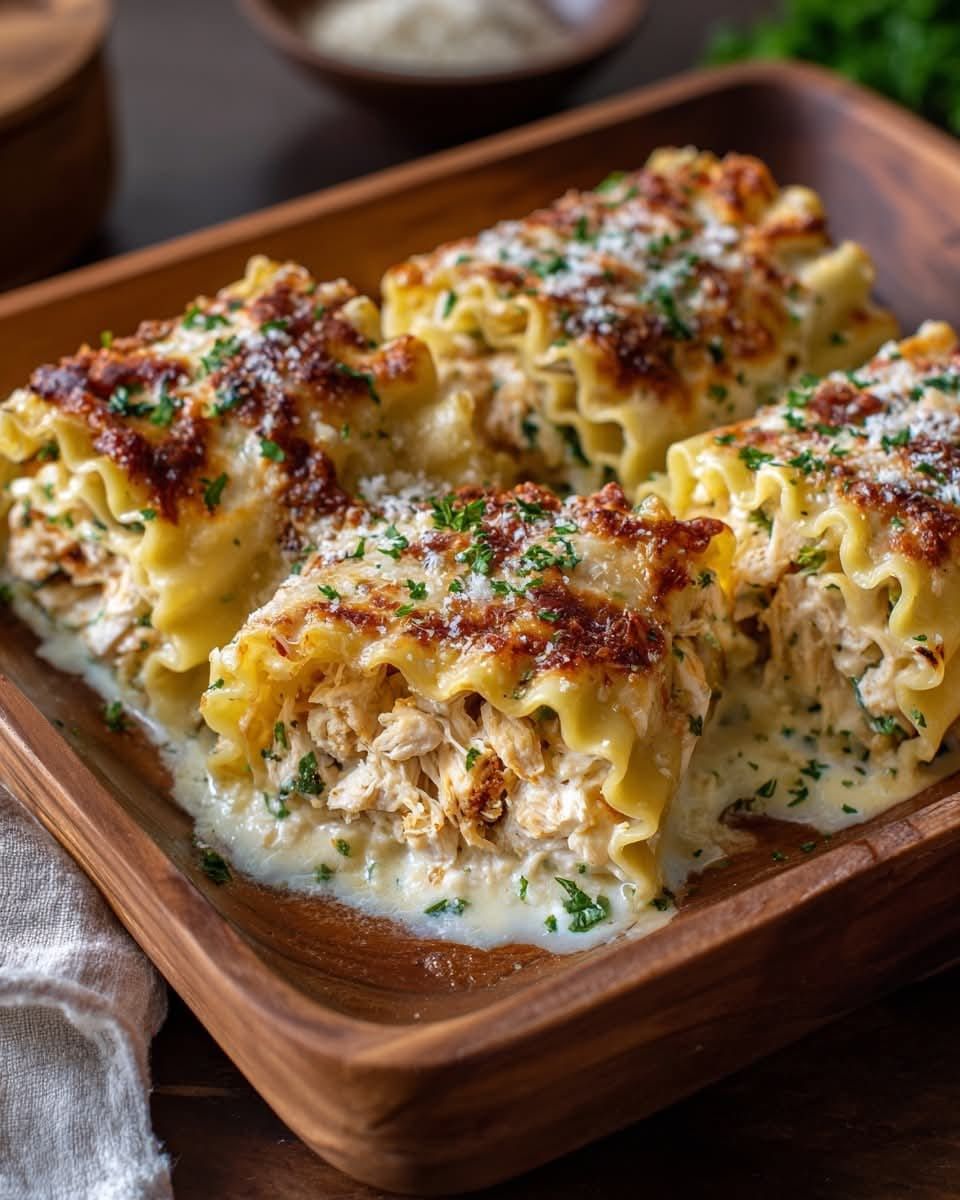 Spread 2–3 tablespoons of the chicken mixture evenly across the noodle.
