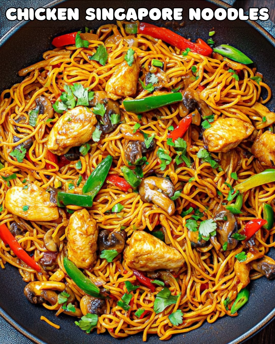 With their brilliant tastes and colorful veggies, these Chicken Singapore Noodles will transport your taste senses to a far-off place. This quick and simple dish brings the flavor of Southeast Asian cuisine into your home with its soft chicken strips, egg noodles, and a fragrant combination of spices. Healthy and filling, this recipe is ideal for meal prep or a midweek supper!