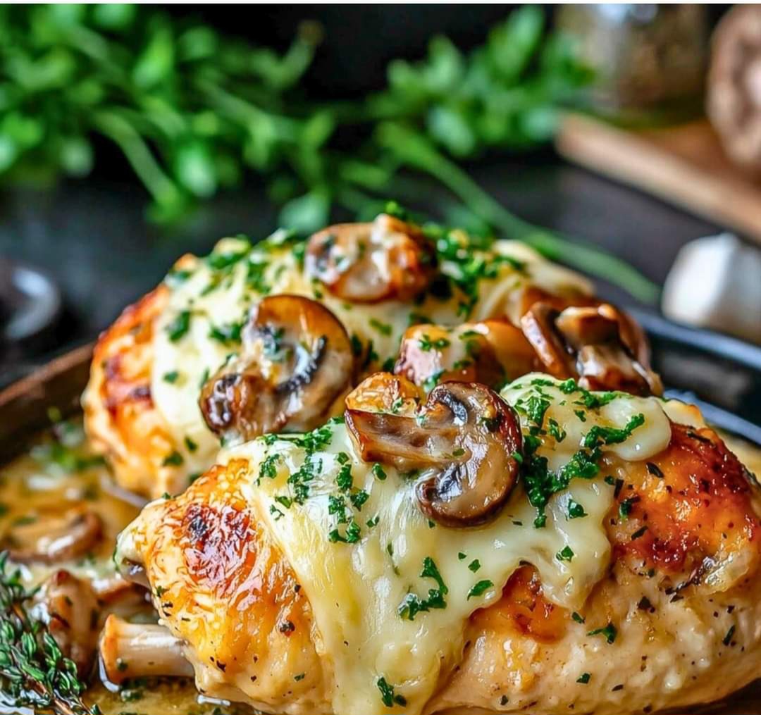 - Serve: Take out the toothpicks and serve the hot stuffed chicken when it has finished baking. If desired, garnish with fresh herbs. This recipe creates a tasty and cozy lunch by combining the rich aromas of garlic, mushrooms, and melted cheese with a nicely cooked chicken breast!