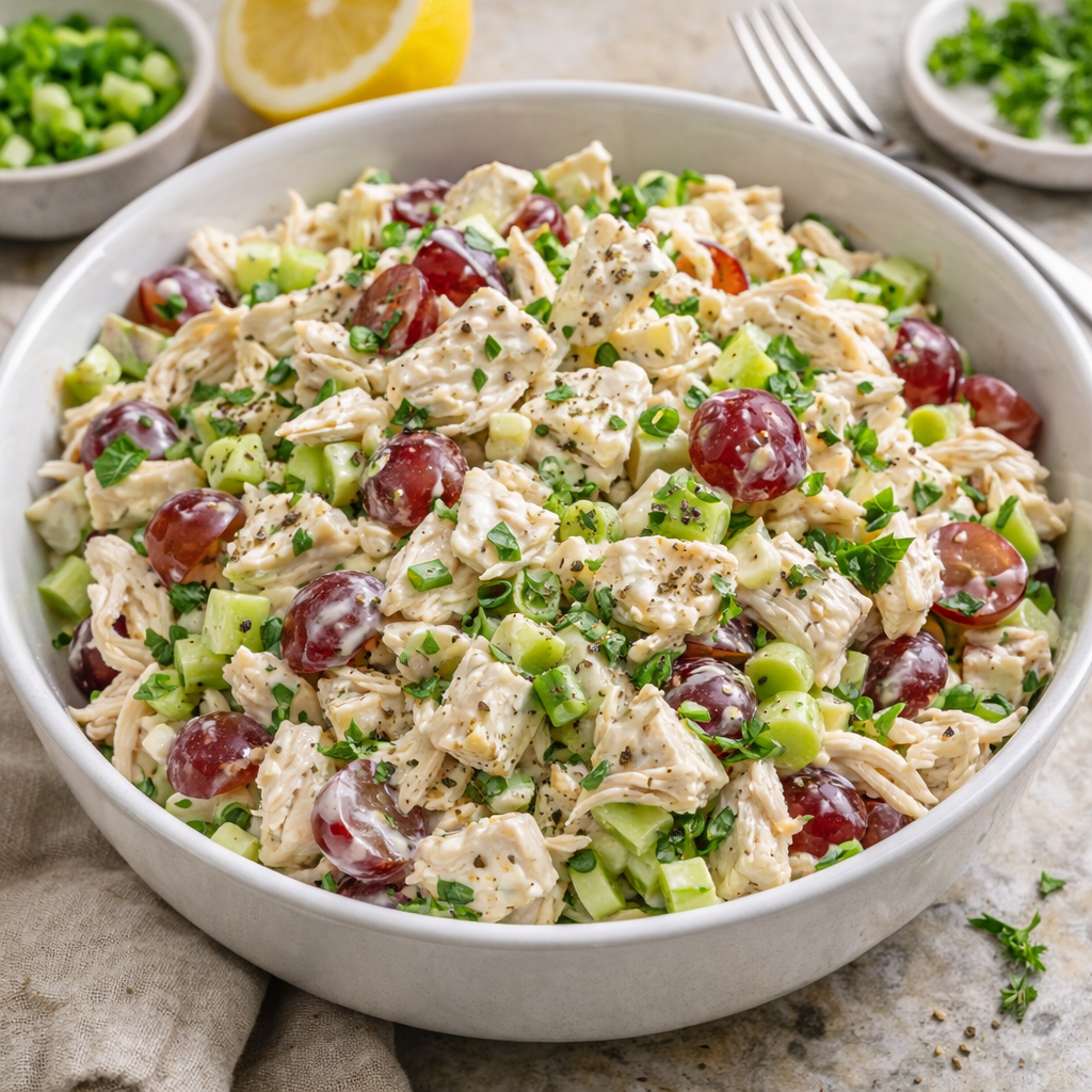 Classic Chicken Salad is a creamy, refreshing dish made with tender cooked chicken, crisp vegetables, and a flavourful mayonnaise-based dressing. It’s versatile, quick to prepare, and perfect for sandwiches, wraps, or served on its own. The combination of textures—juicy chicken, crunchy celery, and optional sweet grapes—makes it a timeless favourite.