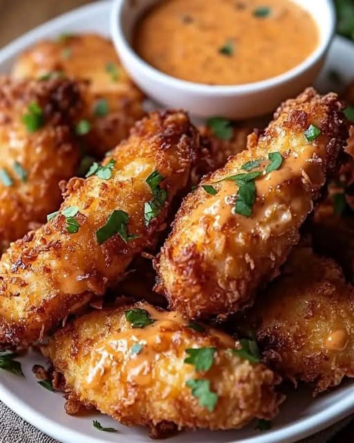 A serving of creamy, spicy Bang Bang Sauce is served with succulent chicken breasts covered in a golden, crispy coconut crust. This savory and sweet meal is a real show-stopper, ideal for special events, daring diners, or just a tasty take on a traditional chicken supper.