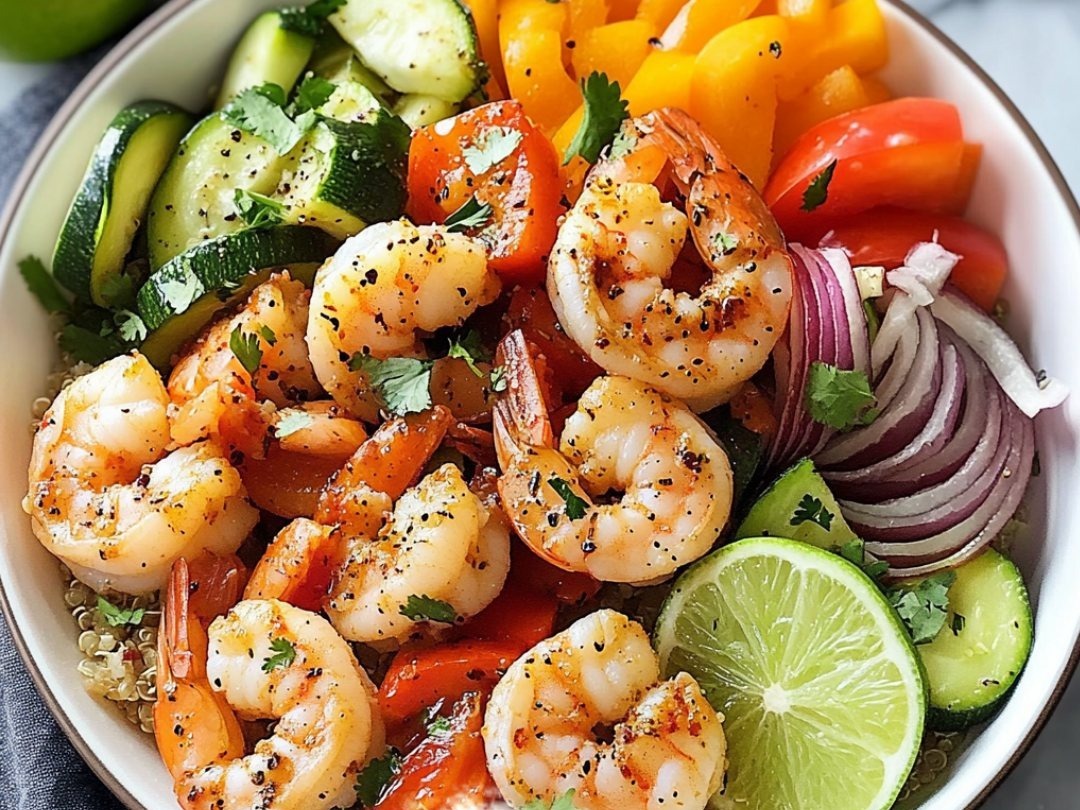 Serve immediately and enjoy your delicious, colorful shrimp & veggie bowl!