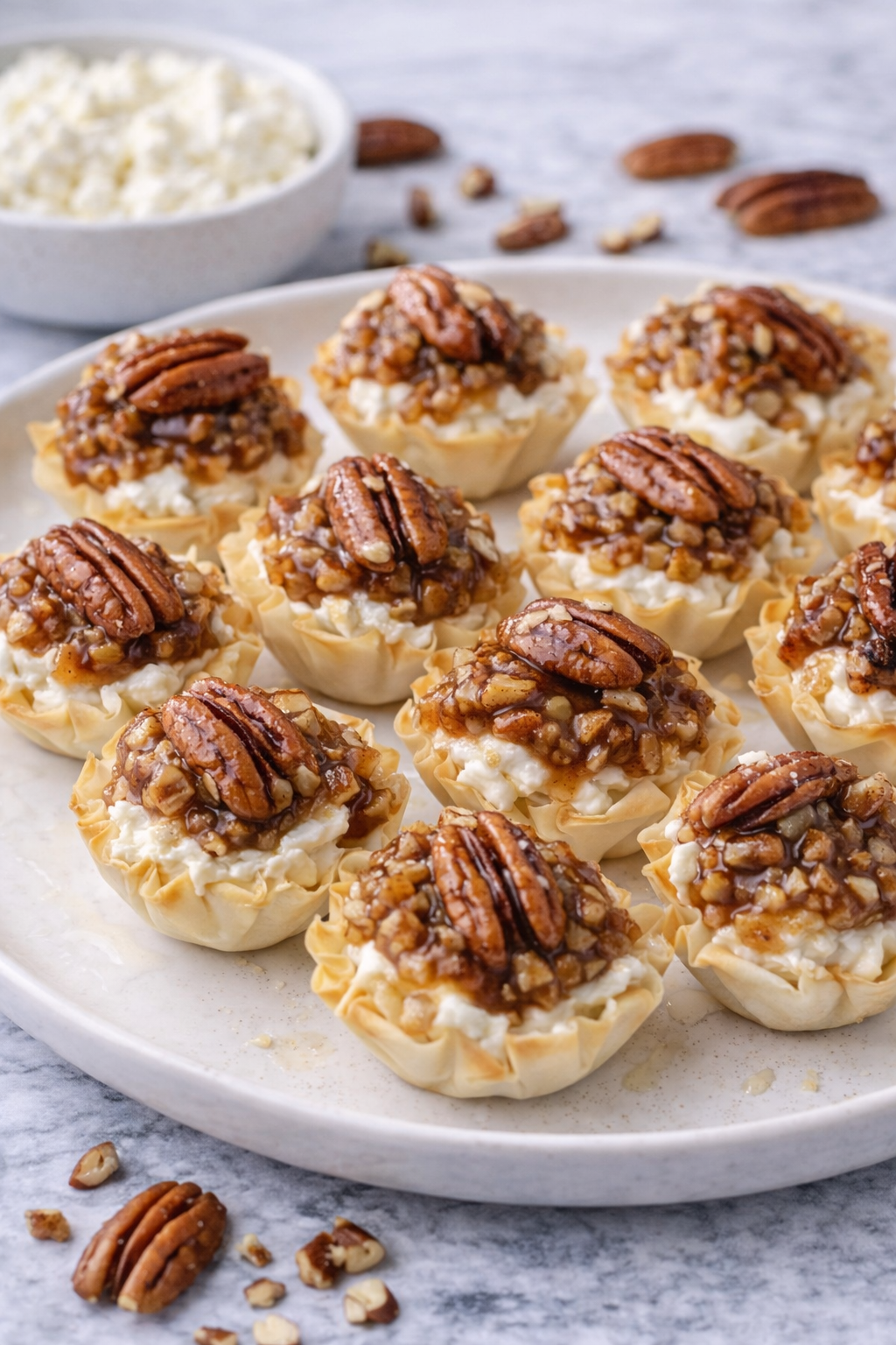 Spoon cottage cheese mixture into each phyllo cup. - Make pecan topping:
