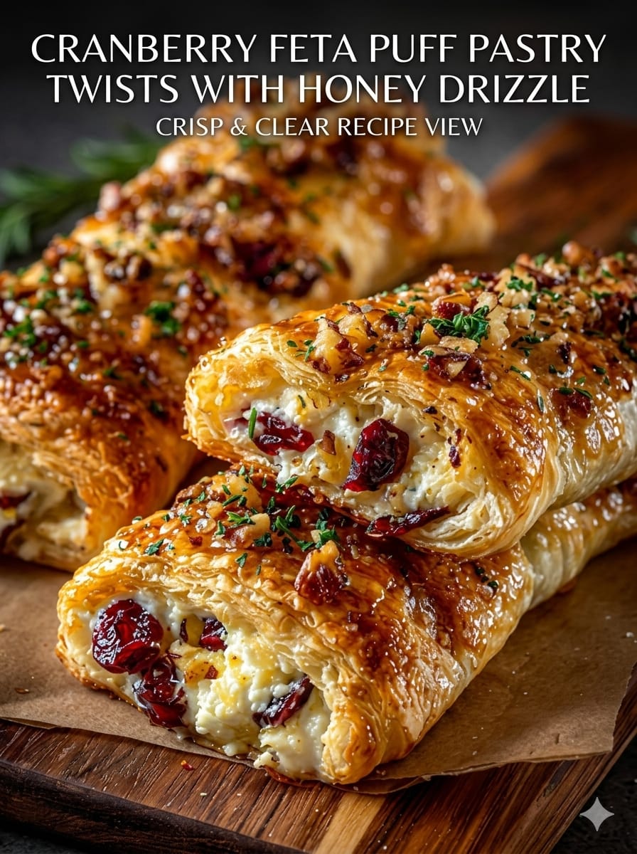 Cranberry Feta Puff Pastry Twists with Honey Drizzle are a perfect blend of flaky pastry, creamy cheese, tart fruit, and warm sweetness. Easy to prepare yet visually stunning, they make an ideal appetizer for gatherings or festive occasions. With their balanced flavors and crisp texture, these twists are sure to become a go-to favorite for effortless entertaining.