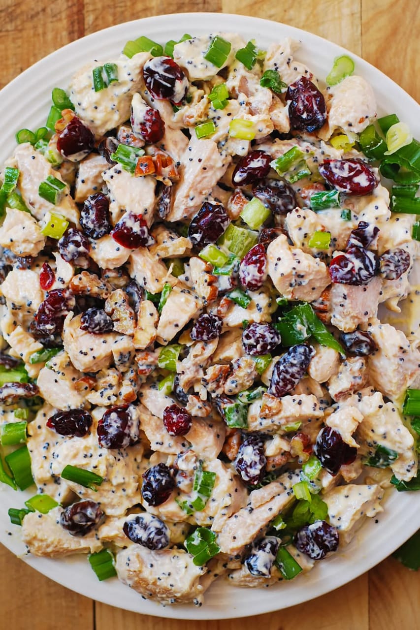 This chicken salad is a perfect blend of savory and sweet flavors with juicy chicken crunchy pecans tart cranberries and a creamy poppy seed dressing. It’s great for meal prep sandwiches wraps or served over greens.