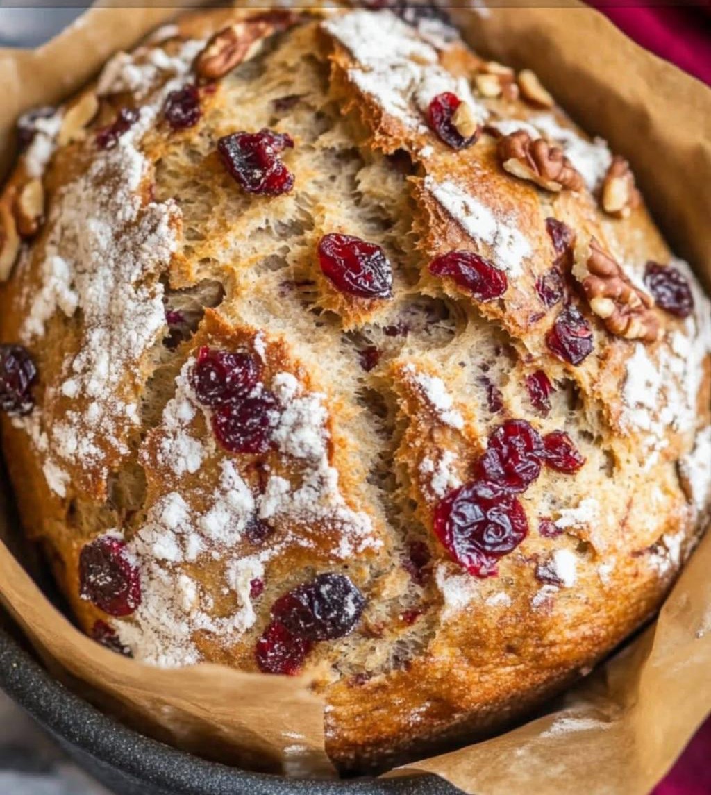This no-knead cranberry walnut bread is rustic, crusty on the outside, and soft and chewy on the inside. Studded with tart cranberries and crunchy walnuts, it’s perfect for breakfast, snacking, or serving with cheese. The best part? No kneading required—just mix, rise, and bake! Ideal for both beginner and seasoned bakers.