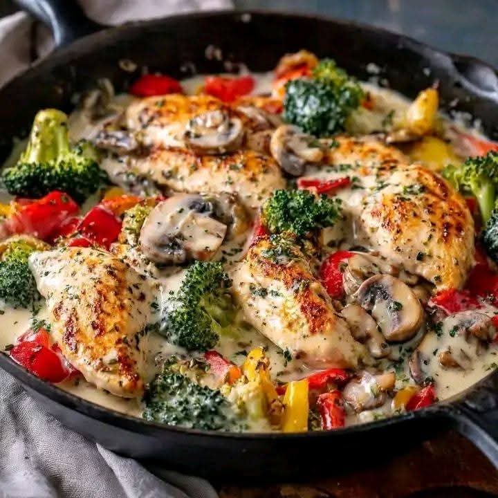 Creamy Chicken & Veg Skillet is one of those reliable recipes that feels comforting without being heavy. The seared chicken locks in flavor, the vegetables add freshness and color, and the creamy garlic thyme sauce brings everything together beautifully.