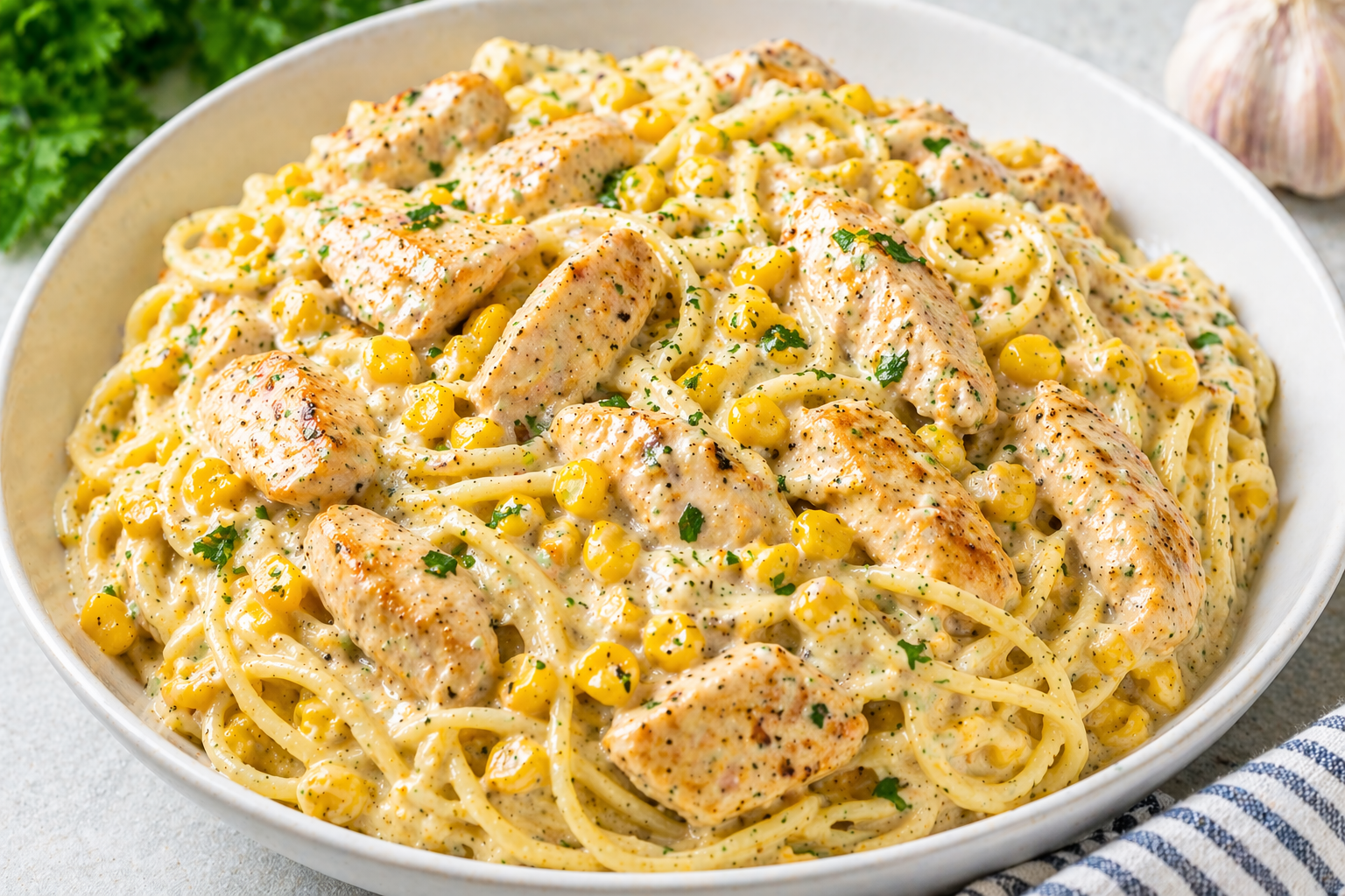 Creamy Garlic Chicken & Corn Spaghetti Salad