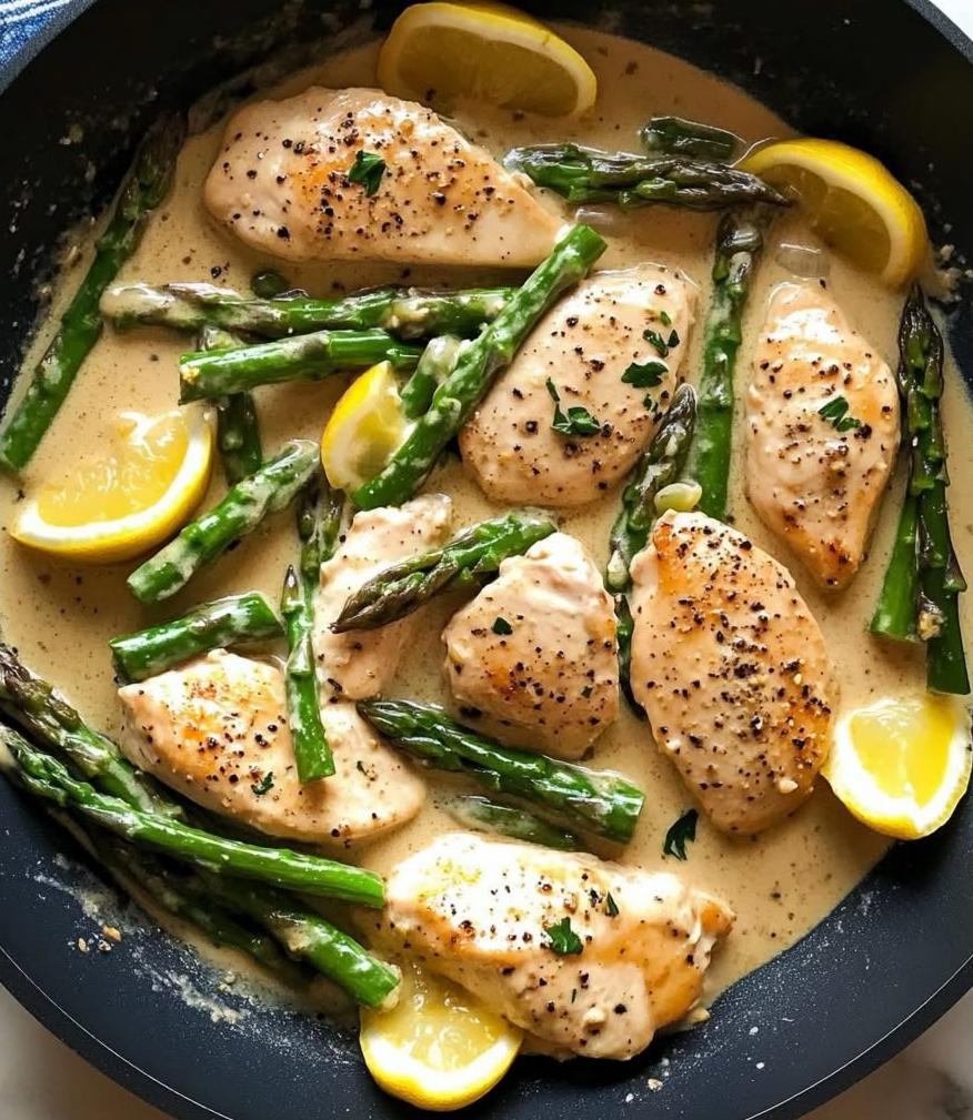 This Creamy Lemon Garlic Chicken with Asparagus is a restaurant-quality dish made in just 30 minutes! Juicy golden-brown chicken is simmered in a rich garlicky lemon cream sauce with tender asparagus creating a meal that’s both comforting and fresh. This one-pan recipe is perfect for weeknights but elegant enough for entertaining. Serve it over pasta rice or with crusty bread to soak up the delicious sauce!