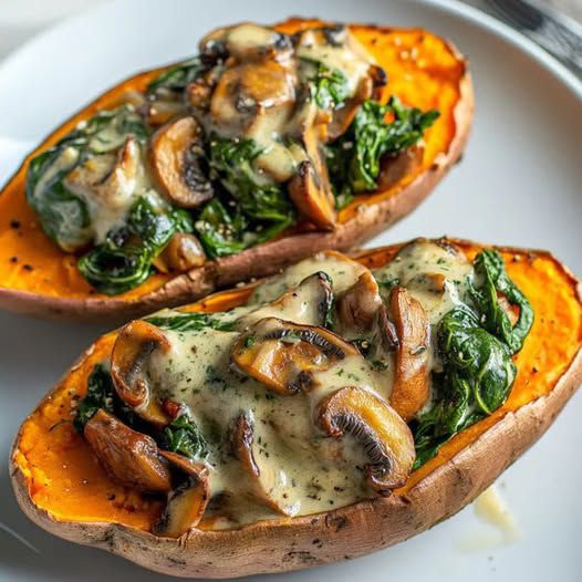 Creamy Mushroom and Spinach Stuffed Sweet Potatoes