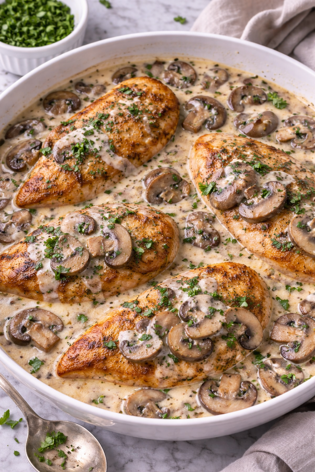 This Creamy Mushroom Chicken is a rich, comforting dish featuring golden-seared chicken breasts smothered in a velvety garlic mushroom sauce. It’s savoury, creamy, and packed with flavour—perfect for a cozy dinner served over rice, pasta, or mashed potatoes.