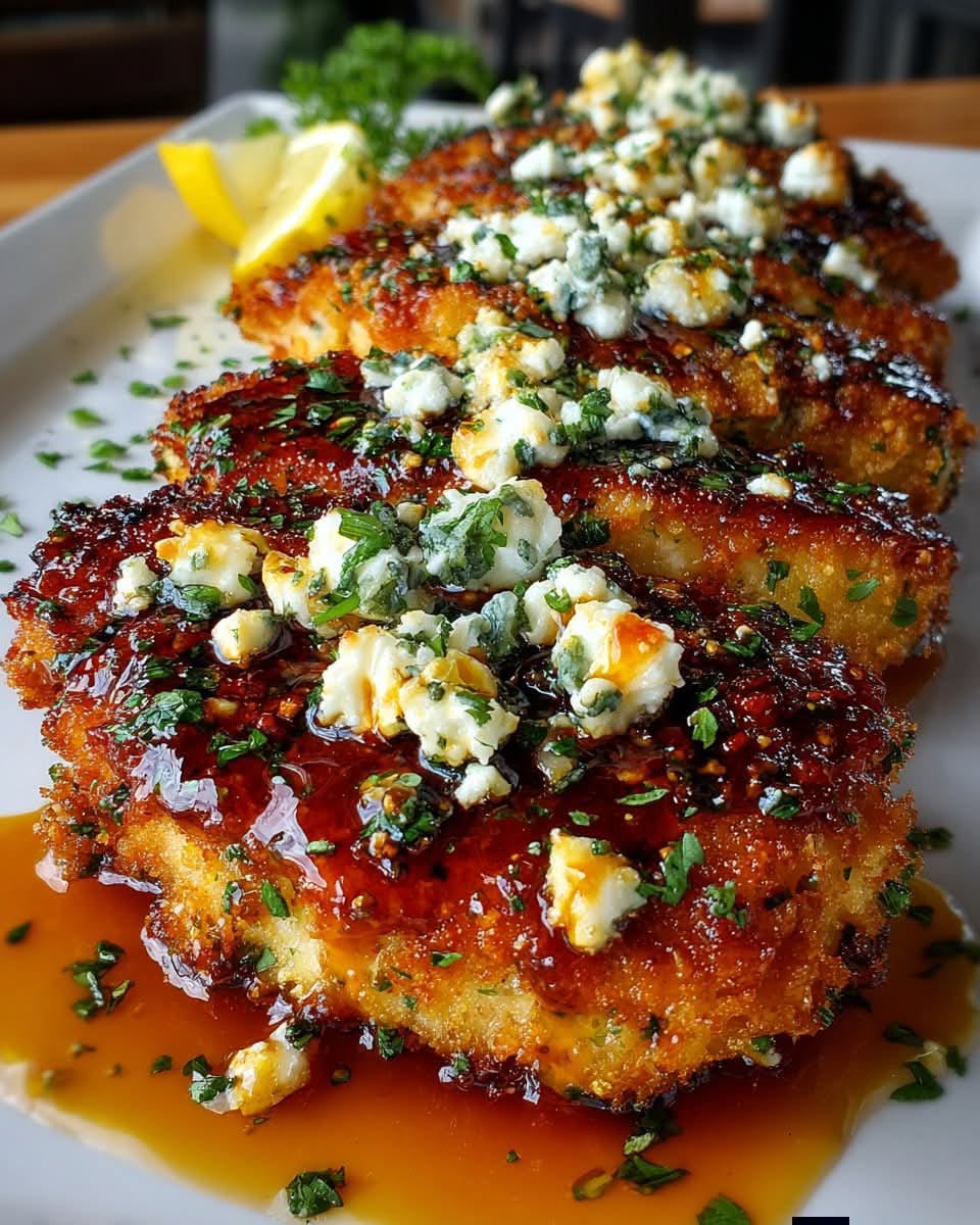 Crispy Baked Hot Honey Lemon Feta Chicken Cutlets with Herb Crust is a flavorful dish that perfectly balances crispy texture, sweet heat, and bright citrus flavors. The crunchy herb coating, juicy chicken, and tangy feta topping make every bite satisfying and delicious.