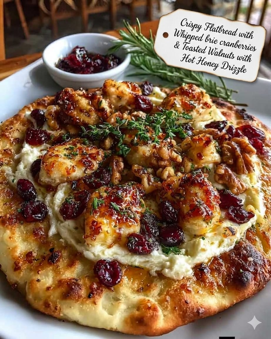 This crispy flatbread is one of those effortlessly elegant recipes that feels fancy but comes together in minutes. It’s the perfect balance of textures and flavors: a golden, crunchy base layered with creamy whipped Brie, sweet-tart cranberries, and nutty toasted walnuts, all finished with a warm drizzle of spicy hot honey. Whether you’re serving it as an appetizer, party snack, or a light meal, it delivers a bakery-style result with very little effort.