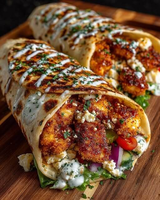 Crispy Hot Honey Feta Chicken Flatbread Wrap with Garlic Yogurt Drizzle