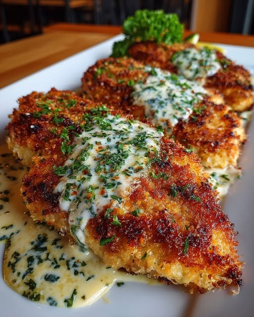 Crispy Panko-Parmesan Chicken with Creamy Ranch and Melted Provolone is a comfort-food classic that combines crunchy texture, savory flavor, and rich, melty cheese in every bite. Juicy chicken breasts are coated in a golden panko and parmesan crust, baked or pan-seared until crisp, then topped with creamy ranch dressing and slices of provolone cheese that melt into a smooth, flavorful finish. This dish is perfect for family dinners, casual entertaining, or a satisfying weeknight meal that feels special without being complicated. The balance between the crunchy coating, tender chicken, tangy ranch, and creamy cheese makes it a crowd-pleasing recipe that pairs beautifully with roasted vegetables, mashed potatoes, or a fresh salad.