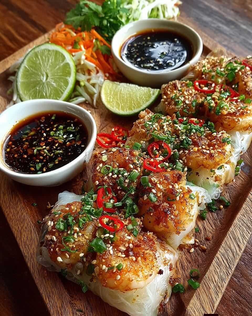 These crispy rice paper shrimp rolls combine succulent prawns, aromatic seasonings, and a perfectly crisp exterior. Enhanced with toasted sesame, fresh chili, and optional saffron, they make an elegant appetizer or snack. The accompanying chili soy dipping sauce balances heat, umami, and a touch of sweetness.