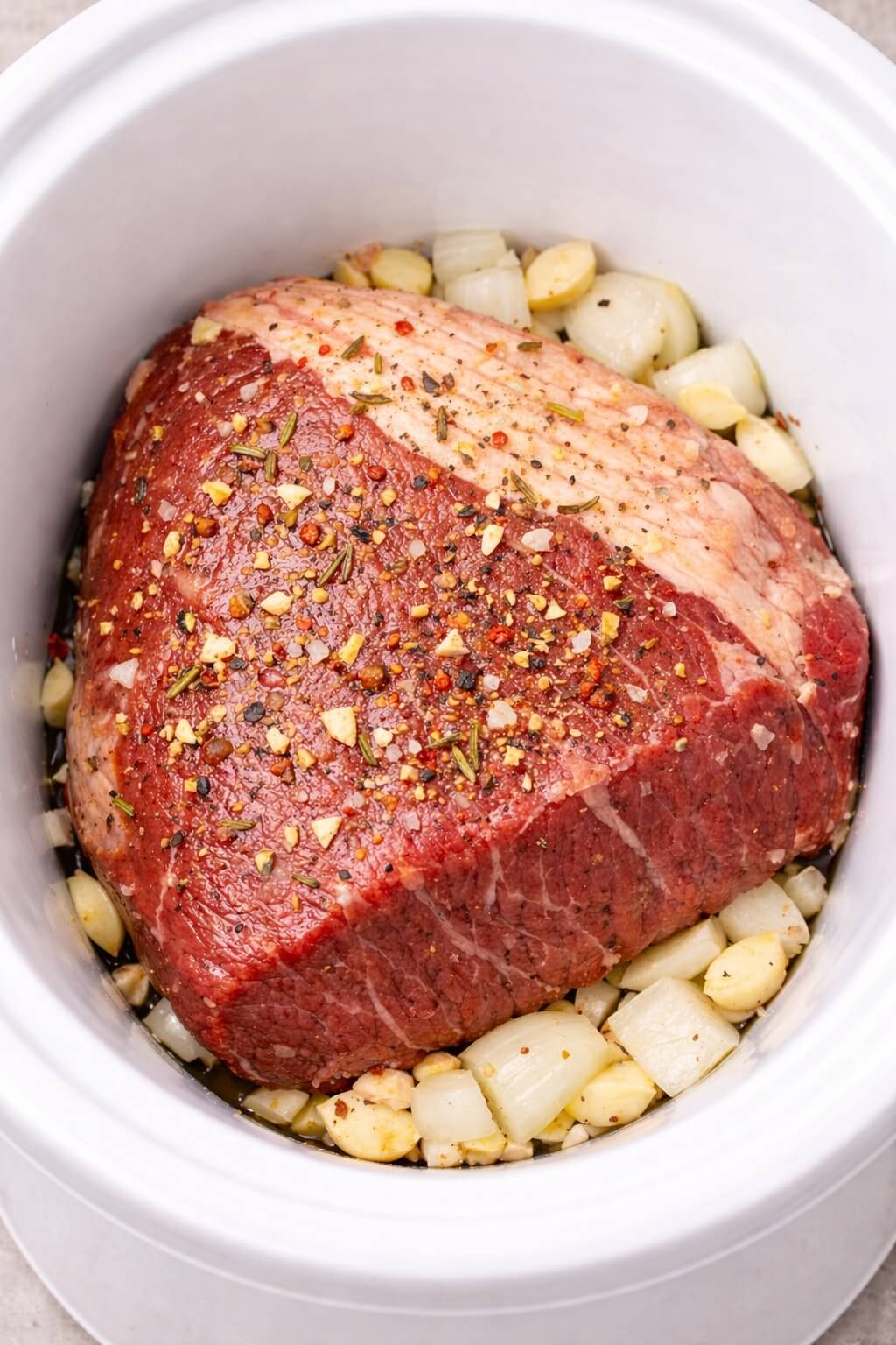 - Assemble: Place onions and garlic in the bottom of the crockpot. Set the roast on top and pour in the beef broth. Add optional vegetables if using.