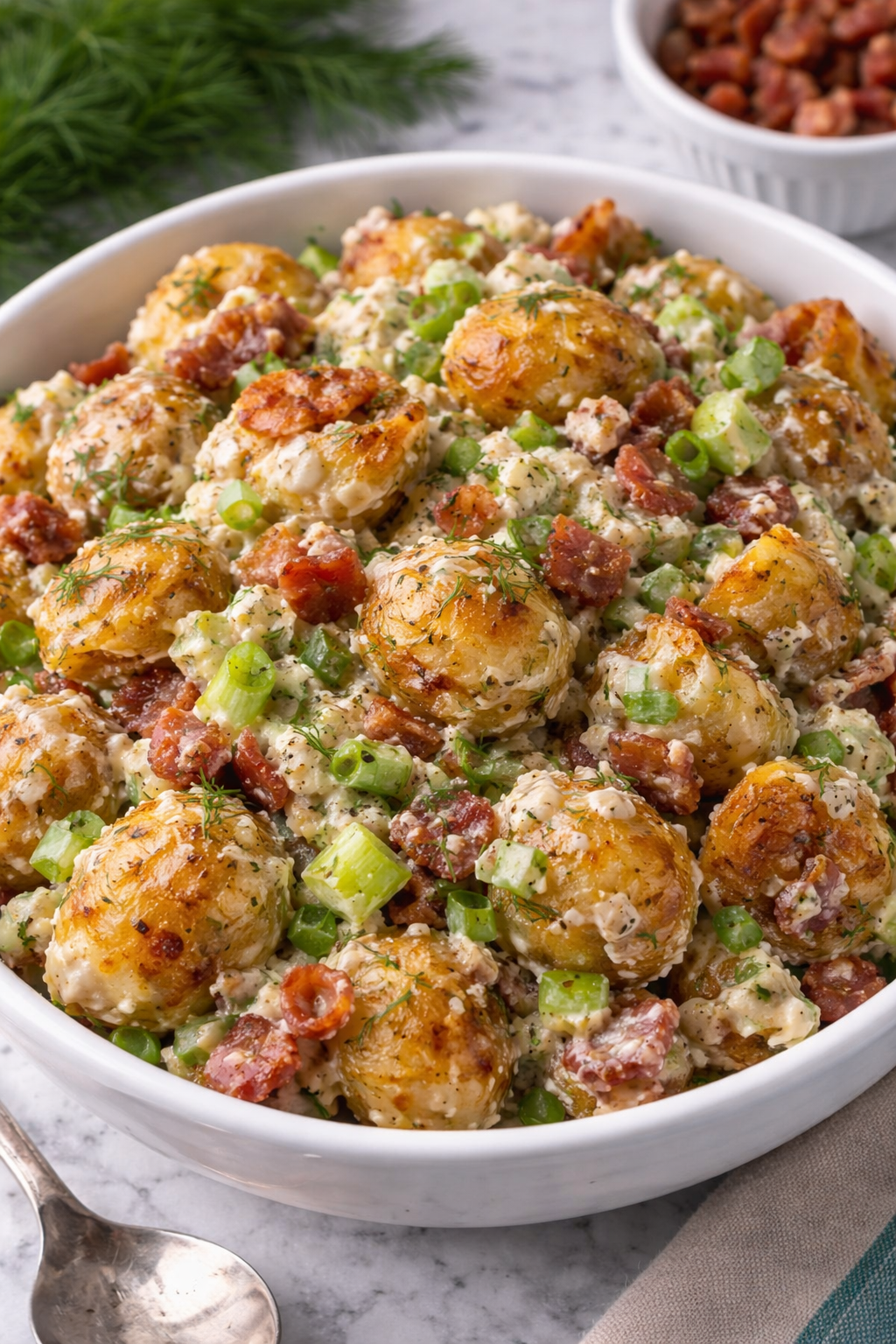 Add roasted potatoes to a large bowl. Toss gently with dressing, bacon, green onions, and dill. - Serve: