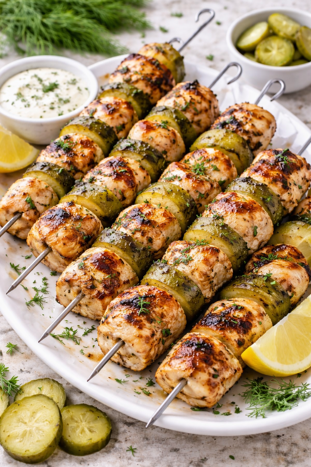 Dill Pickle Chicken Skewers are juicy, tangy, and packed with bold flavour thanks to a unique pickle brine marinade. The chicken becomes incredibly tender while absorbing that signature zesty, garlicky taste. Grilled or baked to perfection, these skewers are slightly smoky, savory, and irresistibly delicious—perfect for BBQs, quick dinners, or fun appetizers.